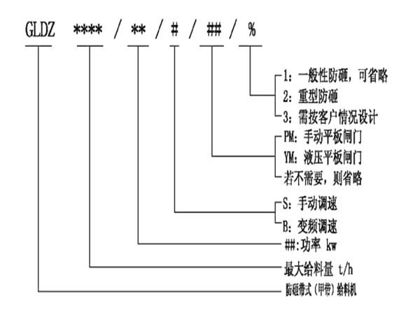 防砸閥門帶式(甲帶)給料機(jī)型號說明: