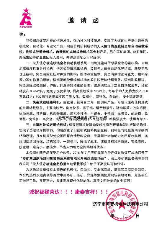 本公司創(chuàng)新產(chǎn)品深受用戶(hù)歡迎,2018年9月棗礦集團(tuán)在岱莊煤礦選煤廠(chǎng)成功召開(kāi)了“棗礦集團(tuán)煤場(chǎng)封閉暨儲(chǔ)裝運(yùn)系統(tǒng)智能化升級(jí)改造現(xiàn)場(chǎng)會(huì)”,會(huì)上棗礦集團(tuán)各級(jí)領(lǐng)導(dǎo)對(duì)我公司“無(wú)人值守旋連全息稱(chēng)重自動(dòng)裝載系統(tǒng)”給予了高度認(rèn)可和好評(píng)。