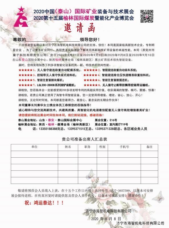 > 邀請函:2020中國(泰山)國際礦業(yè)裝備與技術展覽會